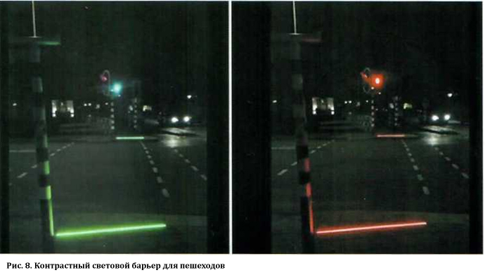 Такое освещение не слепит водителей и обеспечивает необходимую горизонтальную освещенность перехода и вертикальную освещенность пешехода в полный рост. Оптика формирует такую световую диаграмму светильника, которая хорошо освещает пешеходов начиная с подхода к обочинам и на дороге. Более того, для того чтобы повысить видимый контраст пешехода в темной, слабо отражающей одежде, часть света направляется на дорогу за пешеходом. В этом случае водитель видит черный силуэт пешехода на фоне светло-серого асфальта.