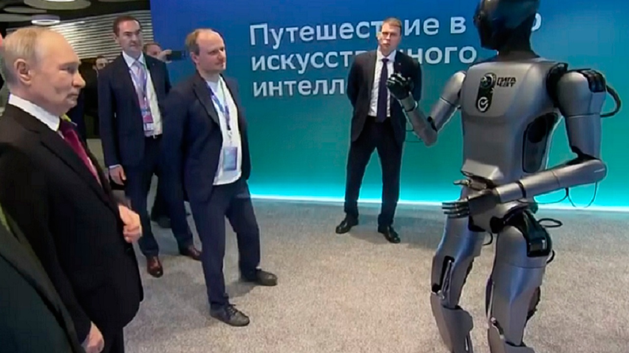 Путин побеседовал с танцующим гуманоидом (человекоподобным роботом) от Сбера Президент России Владимир Путин осмотрел выставку в рамках конференции «Путешествие в мир искусственного интеллекта». Он приехал в штаб-квартиру Сбера в Москве, где его встретил робот. На кадрах видно, как механизм в виде человека приветствует российского лидера. После этого, робот демонстрирует заранее заученные танцевальные движения. Он довольно плавно двигает механическими руками и приседает. источник с видео - здесьвидео - здесь